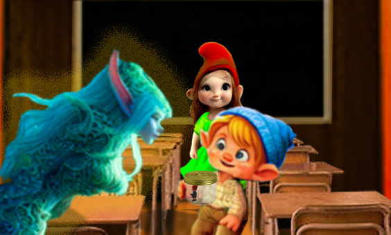 Plotseling krijgt hij een idee. Juf Grentina, ja zij weet vast raad. Behoedzaam loopt hij met het potje naar de klas waar de juf aan het werk is.