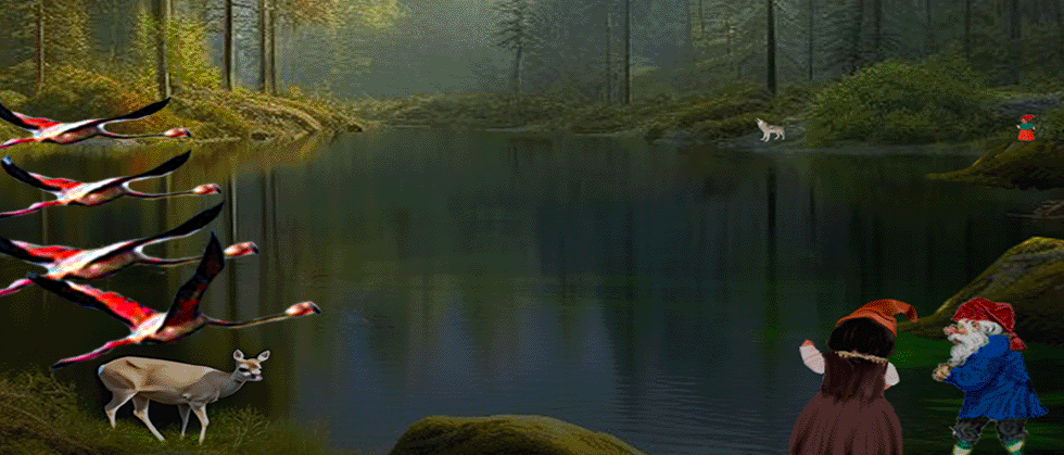 ‘Wij zijn op weg naar het blauwe kreeftenmeer, maar we hebben geen idee hoe we daar, van hieruit moeten komen. Het bos is hier zo dicht. Wel mooi hoor, maar niet voor flamingo’s, door al die bomen kunnen wij ons niet oriënteren.’