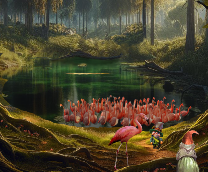 Daar aangekomen vallen hun mondjes open van verbazing. Zoiets moois hadden ze nog nooit gezien. Midden in het bos staan tientallen roze vogels, die verdwaast om zich heen kijken.