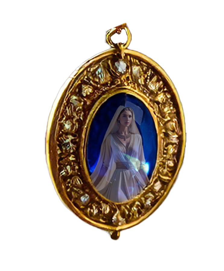 ‘Ik ben opzoek naar mijn vader, maar de enige aanwijzing die ik heb is dit medaillon.’ Behoedzaam haalt hij het medaillon uit zijn zak en laat het haar zien. ‘Kent u misschien deze dame?’